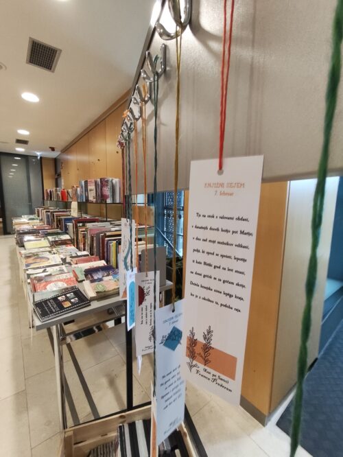 Knjige so bile razvrščene po tematikah, poimenovanih v duhu jezika tedanjega časa (npr. bukve za deco, knjižine za jestvine, apotekarija …). Obiskovalce smo obdarili tudi s posebej za to priložnost izdelanimi knjižnimi kazalkami s Prešernovimi verzi, s figami in brezplačnimi izvodi različnih pesniških zbirk.